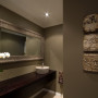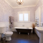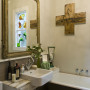 Don’t be nervous of going overboard with accessories and art. It can save a bathroom from looking too utilitarian and help establish a theme, like in this glamorous solution with its over-sized gilt mirror, chandelier and cross artwork. The chandelier throws off a dappled moody light onto the Resene Quarter Ash walls.