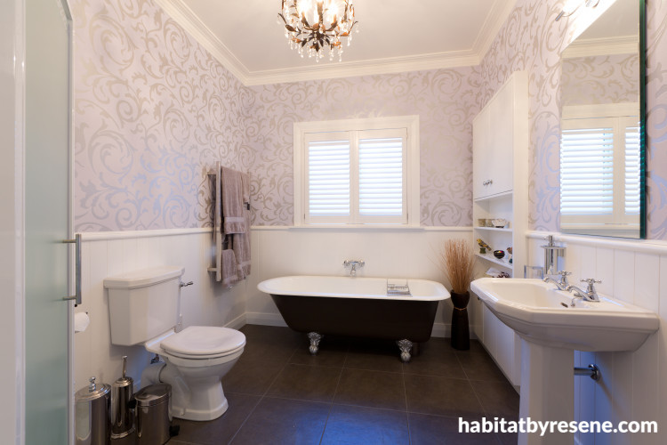 Wallpaper hasn’t been seen in bathrooms for a while but is now on the comeback, providing character and interest. The large stylised leaf pattern and subtle colouring of this Brocante 11 (45932) wallpaper from Resene gives a sophisticated yet light and airy look. The trims and panelling are in Resene White, and the clawfoot bath is in Resene Triple Masala.