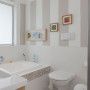 An otherwise simple bathroom is given a simple paint effect by having wide stripes roughly painted in Resene Cloud with a roller by homeowner and designer Lian Bruce. The walls are in Resene Alabaster.