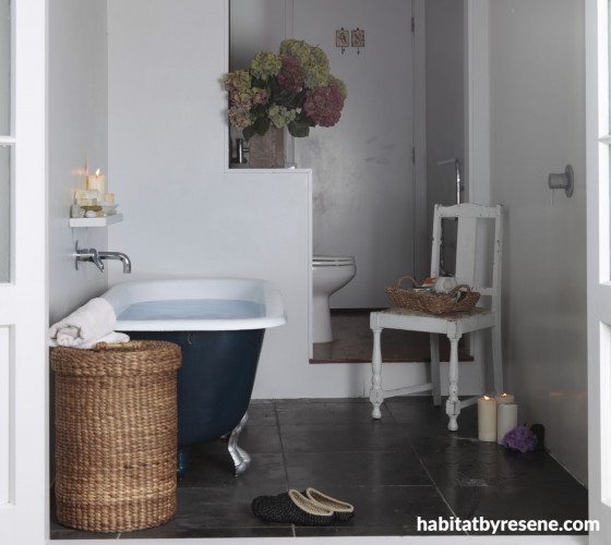 If you are wary of using a strong colour like this rich blue Resene Confidante on every wall of the bathroom, just use it as a feature. Here, it frames the old clawfoot bath. This featured as a Resene-sponsored feature in Good magazine.