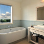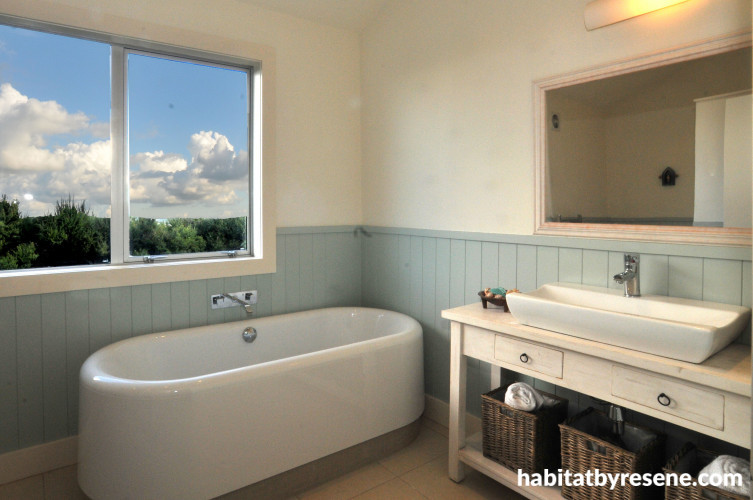 Even the bathroom can take its colour cue from the environment. For this coastal home, the colours of the sea and sand are interpreted in Resene Periglacial Blue on the tongue-and-groove panelling, with Resene Rice Cake on the walls and ceiling.