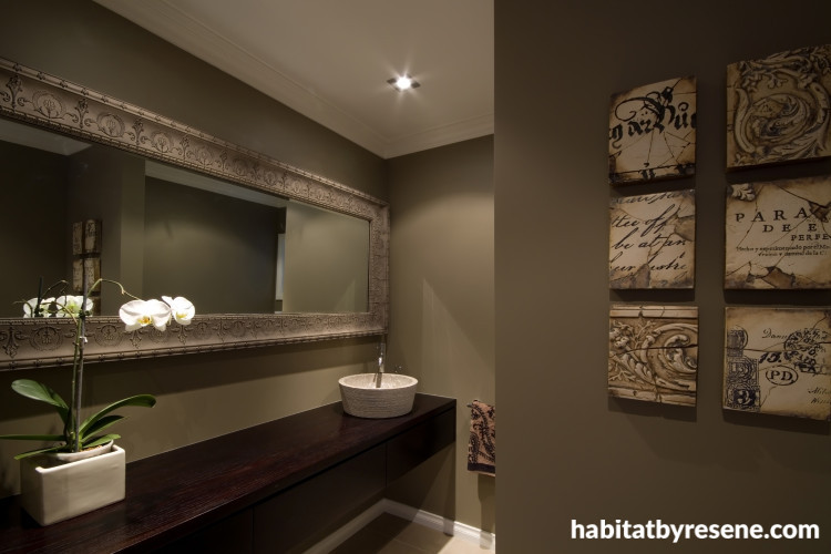 Rather than try to make the smallest room feel larger by using only light, plain colours, it can be given a moody ‘pamper palace’ feel by using dark shades. This powder room, designed by Von Sturmer’s, has a long heavily framed mirror and walls in Resene Triple Tea.