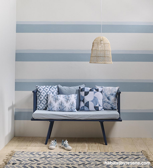 Stripes are a good starting point when trying to incorporate more than one pattern into a room, as they mix well with prints including botanicals and geometrics. Not all stripes are created equal. Create crisp lines using painter’s tape or create a soft watery-effect with hand-painted soft edges. Main wall base colour and side wall painted in Resene Alabaster, thick stripe in Resene Frozen and hand-painted soft stripe in Resene Quarter Frozen. Flooring stained in Resene Colorwood Natural and bench seat in Resene Biscay. Light blue cushion from H&M Home, patterned cushions and rug from Spotlight. Project by Vanessa Nouwens, image by Bryce Carleton.
