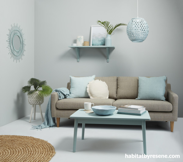 To get the most tranquility out of calming blue tones, create a truly harmonious look by continuing different hues onto your soft furnishings, light fixtures and furniture. Walls in Resene Duck Egg Blue, floor in Resene Quarter Duck Egg Blue, coffee table and shelf in Resene Unwind, pendant lamp and mirror in Resene Raindance, plant stand in Resene Quarter Tea and small accessories in Resene Slipstream, Resene Raindance and Resene Quarter Tea. Sofa from Me & My Trend, rug from Freedom Furniture, cushions from Allium Interiors and Adairs, throw from Adairs.