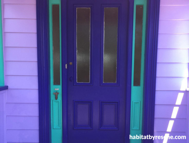 The colourful palette of this Auckland bungalow includes Resene Biloba Flower for the main violet colour of the house, Resene Deep Koamaru on the front door and Resene Niagara for the green trims.