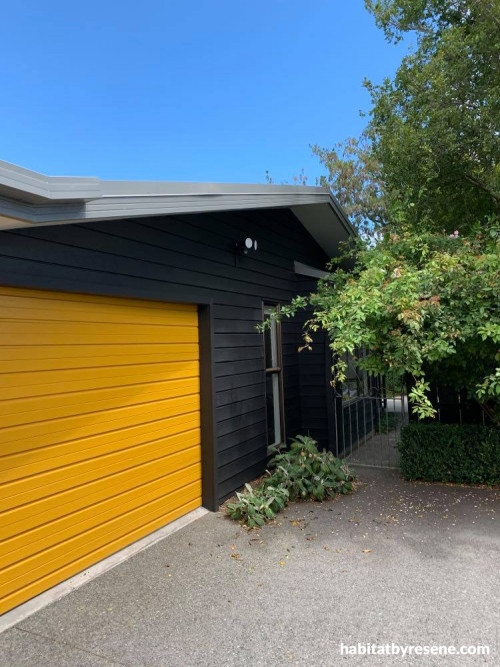 Homeowner Katrina wanted a more contemporary look for her home in tune with its 1970s era of construction. The colour consultant at Resene ColorShop Tower Junction helped choose the main colour, Resene Element. “I am a stickler for keeping with the era so the colour Resene Element was a good compromise as it’s a soft black,” says Katrina. “The choice to do Resene Hot Toddy on the garage door and front door was inspired by an outdoor chair from Nood. We quickly grew to love the intense yellow. On cloudy days it resembles more of a mustard, but on bright days it seems to harness the power of the sun!”