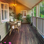 Resene Triple Bison Hide is also painted on the uncovered veranda. The window trims, porch roof and balustrade are Resene Black White.