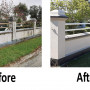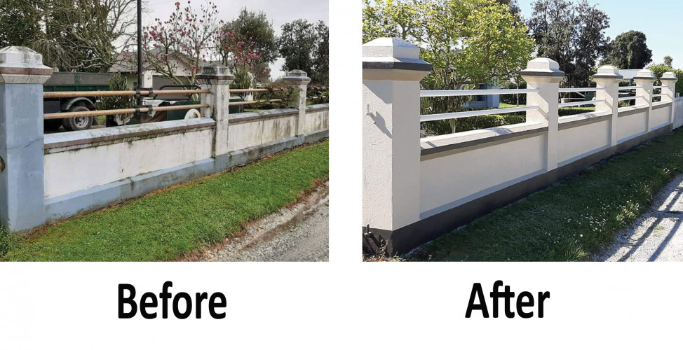 The fence is painted Resene Bison Hide with a strip of Resene Ironsand on the bottom and top and on the post detailing.