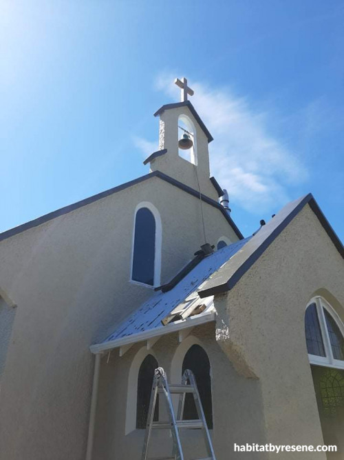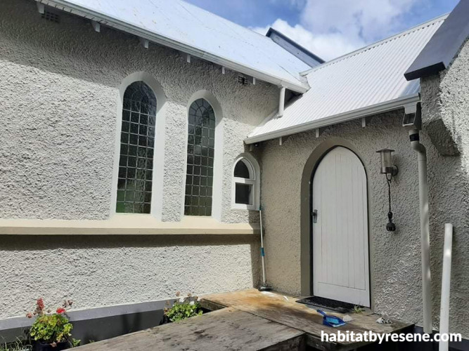 The upgrade on this fence is just the beginning of this miraculous exterior transformation. Megan and her husband Bryan have been renovating a church near Nelson this summer, a DIY project that has been ongoing since Bryan bought the building back in 1999 when the church was de-consecrated. The exterior colour scheme includes Resene Bison Hide in several different strengths with Resene Ironsand and Resene Alabaster on the trims and arched windows.