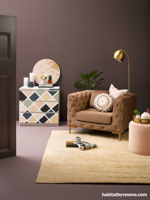 The addition of plush velvets in deep purple hues over a rich palette of Resene mushroom taupes is a gorgeous winter look. Walls are painted in Resene Rocky Mountain, floor in Resene Sixth Sense and door in Resene Thunder Road. Side tables are in Resene Rivergum and the chest of drawers are painted in Resene Alabaster with a harlequin pattern in Resene Despacito, Resene Peace, Resene Safehaven, Resene Shabby Chic, Resene Porter and Resene Crowdpleaser. Short ribbed plant pot in Resene Safehaven, large ribbed plant pot in Resene Indian Ink and large basket (with plant) in Resene Safehaven. On the ottoman, the tray is painted in Resene Courage and the plant pot (on tray) is in Resene Grey Olive. Candlesticks in Resene Courage and Resene Noir, basket (with throws) in Resene Eighth Stonewashed (top) and Resene Courage (bottom).