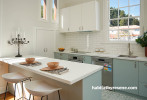 These breath-taking revived kitchen walls and cupboards are painted in Resene Double Sea Fog with trims in Resene Lustacryl tinted to Resene Black White.
