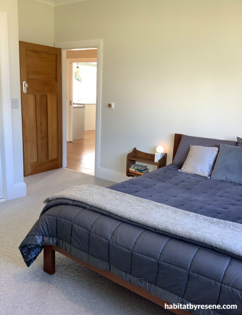 Justine wanted the bedrooms to be calming and restful, so she chose softer colours for these spaces. In the master bedroom Resene Half Thorndon Cream features on the walls with Resene Double Alabaster on the ceiling and trims, and a restful palette of greys similar to Resene Half Jumbo, Resene Dune and Resene Bounty come together on the bedding.