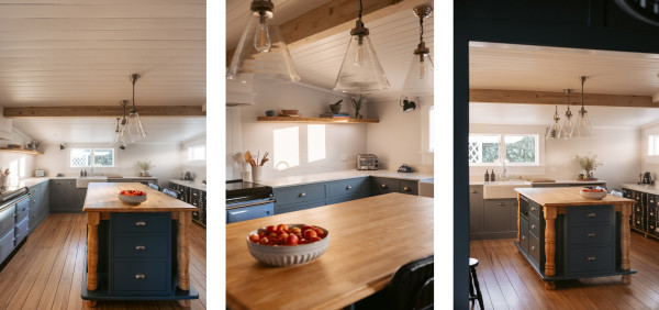Kitchen cabinetry painted in Resene Rolling Stone, kitchen island in Big Stone, walls in Sea Fog and ceiling in Alabaster.