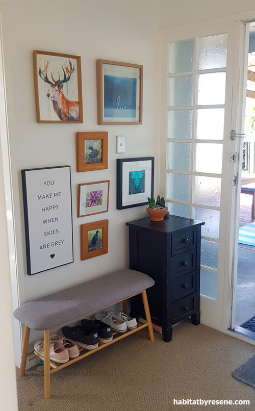 Kirsty and Tory’s inviting entryway sets the calm and clean tone for the house. The entryway, and main living area, walls are in Resene Alabaster. The bench cushions give a taste of the subtle greys used throughout the house.