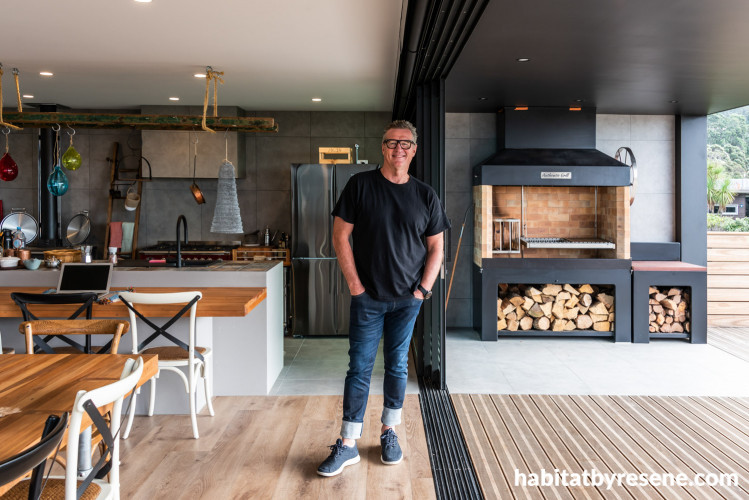 Sir John Kirwan (JK) and his wife Fiorella’s bach in Waihi Beach has a simple design and colour scheme, keeping the focus on relaxation, family and socialising. The walls, ceiling and trims of the entire interior of the house are painted in Resene Black White. Resene Element is used on the soffit over the deck.