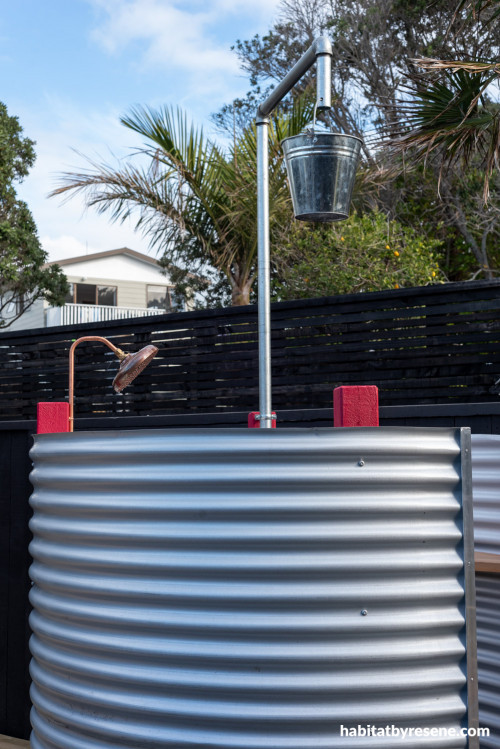 The outdoor shower was a must-have for surf-lover JK. The dark brown fence is Resene Woodsman CoolColour Shadow Match. The CoolColour version was chosen to give the fence added durability and heat reflection in the hot coastal climate.
