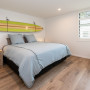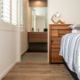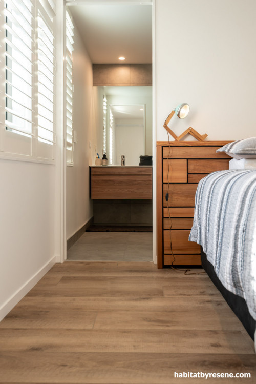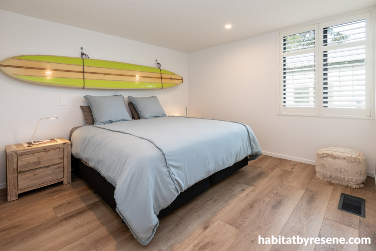 Catherine used JK’s love of surfing as design inspiration in the four bedrooms. She kept the backdrop simple with Resene Black White on the walls and chose rustic wood and décor pieces made of natural fibres. The window shutters, from Window Treatments NZ, give the room the feeling of an old-fashioned cottage.