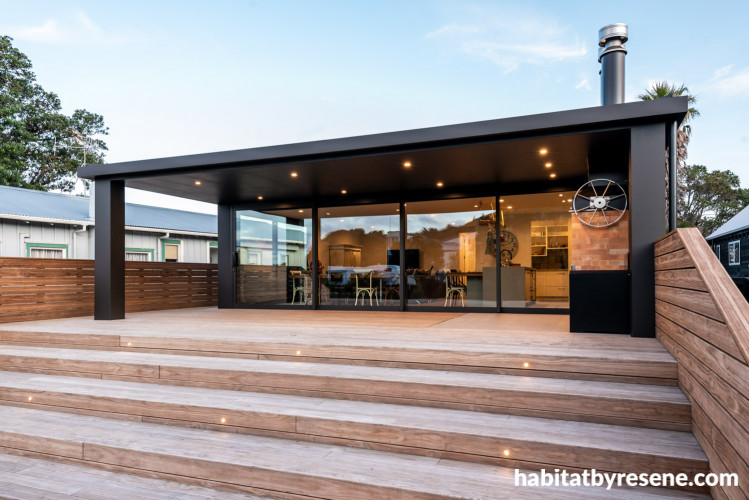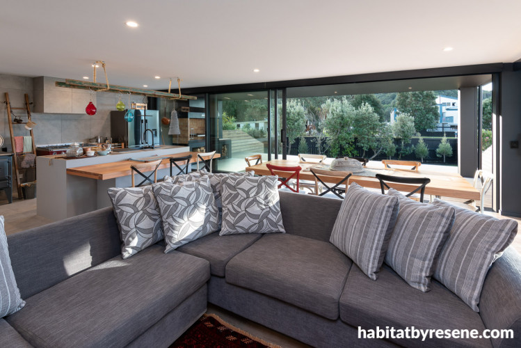 JK and Fiorella wanted to create a bach that would be used by their family for generations to come, and their living areas emphasise socialising and cooking. The lounge flows onto an extensive decking area which means dining can easily move outdoors in the summer months. The walls, ceiling and trims of the lounge are Resene Black White and the soffit is Resene Element, the fence in the distance is Resene Woodsman CoolColour Shadow Match.