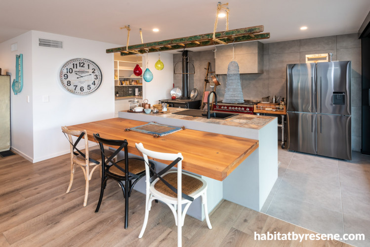 Catherine used Resene Black White on the walls, ceiling and trims to create a neutral backdrop to highlight rustic pieces such as a ladder in the kitchen, used to hang pots and pans.