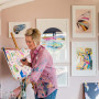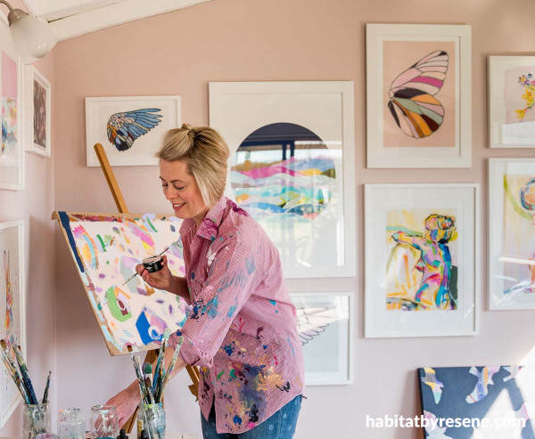 Libby’s light-filled, joyful studio is painted in Resene Blanched Pink from the Karen Walker Paints collection. “I particularly love the colours, Resene Half Smalt Blue and Resene Blanched Pink, which are both from the Karen Walker Paints collection,” she says. “I feel like they are statement colours and quite bold, but still soft and welcoming. They work well in an old home and are a lovely backdrop for artworks.”