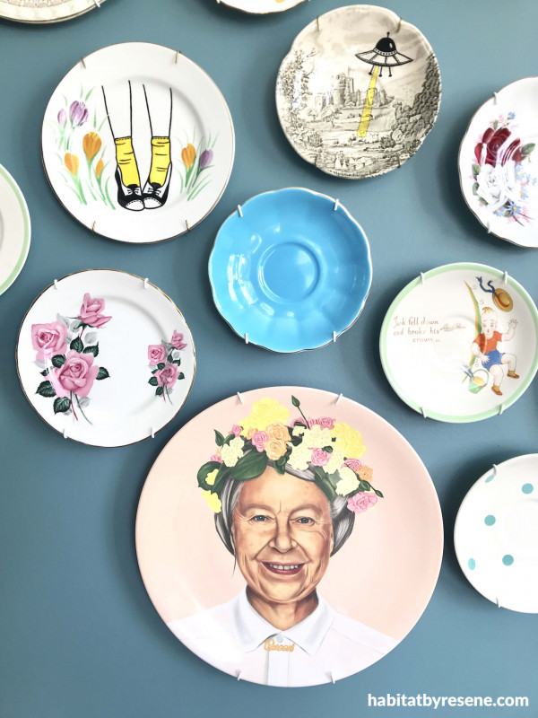A detail of Libby's plate collection. The kitchen wall is in Resene Half Smalt Blue from the Karen Walker Paints collection.