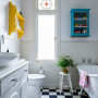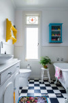 The family bathroom is painted in two shades of fresh white – Resene Eighth Blanc on the walls and Resene Blanc on the tongue-and-groove panelling. The sizzling yellow shelving unit on the left is painted in Resene Bright Spark. The blue cabinet (on the right) was already painted; for a similar bold, sunny-day blue check out Resene Aquarius or Resene Allports.