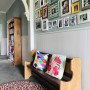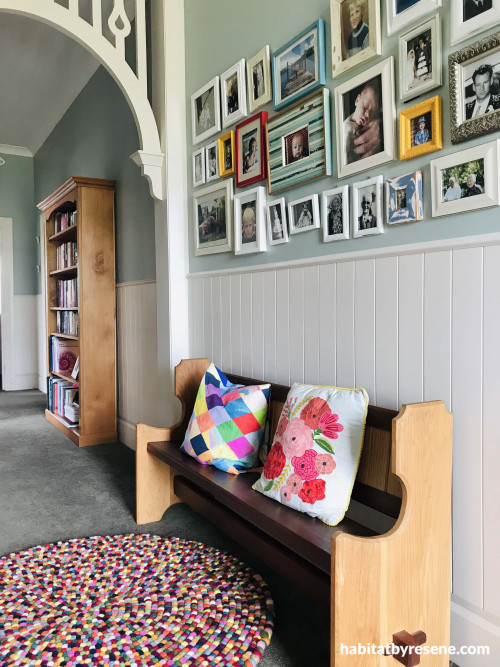 In the hallway, the calming blue/grey tone of Resene Robin Egg Blue provides a perfect background for one of the home’s many gallery walls. Resene Blanc is used on the tongue and groove panelling and decorative architrave. Libby also painted the two yellow frames in Resene Bright Spark.