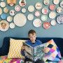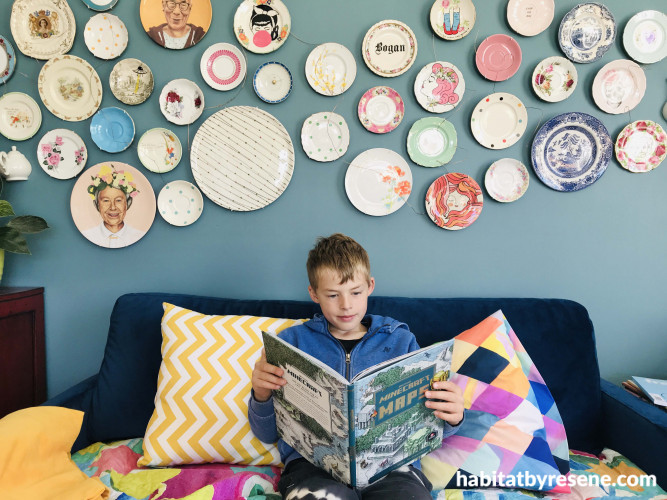 Will polishes up his Minecraft skills on a seat near the family kitchen. Mum Libby’s plate collection hangs behind him on a wall painted in Resene Half Smalt Blue from the Karen Walker Paints collection.
