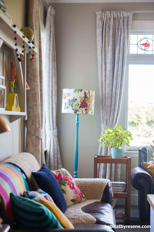 The lounge is painted in Resene Akaroa with Resene Blanc on the trims. Aaron made the shelves from an original fireplace surrounds and painted it in Resene Blanc. Libby added a pop of colour painting the lampstand Resene Allports.