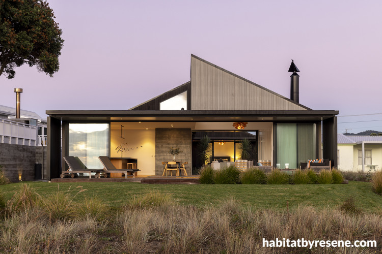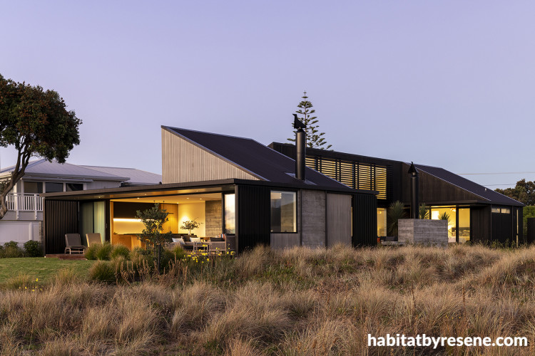 The dark exterior, in Resene Wood-X tinted to Resene Foundry, provides a stunning contrast to the coastal environment and greenery.