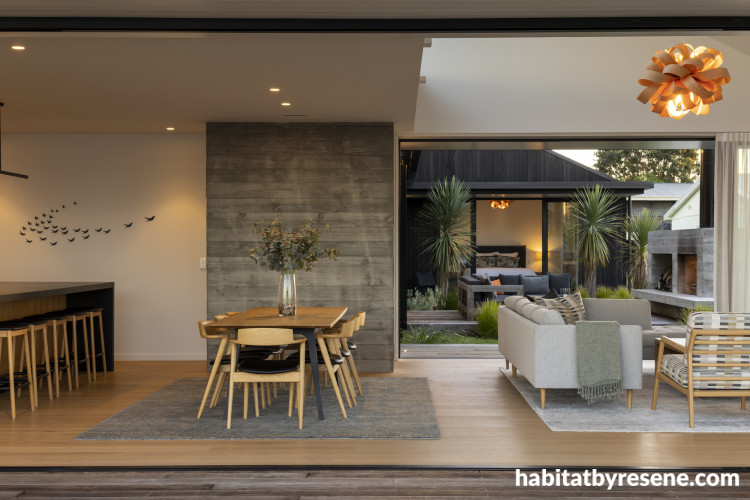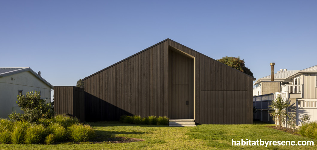 From the front entrance it’s hard to tell what beauty lies beyond. The exterior is coated in Resene Wood-X tinted to Resene Foundry and Resene Pioneer highlights the unique entrance.