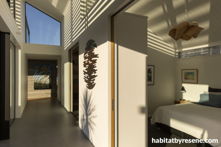 The hallway and gallery creates a holiday retreat feel with an abundance of sunlight streaming into every corner. The walls, trims and ceiling are painted in Resene Double Alabaster.
