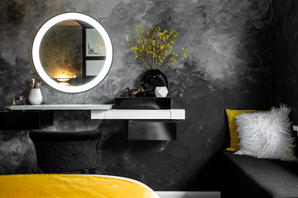 “I was fortunate enough to be given relatively free license on the design of the bedroom. While the basic design was there with the ombre effect, the painting technique very much evolved during the painting of the room. The fade from light to dark was used to highlight the specific design focus areas of the room, such as the bedhead and the floating vanity. The technique itself, hand brushing combinations of black, white and three different greys on the walls and ceiling, helped to create areas of smoothness and areas of texture in the room.