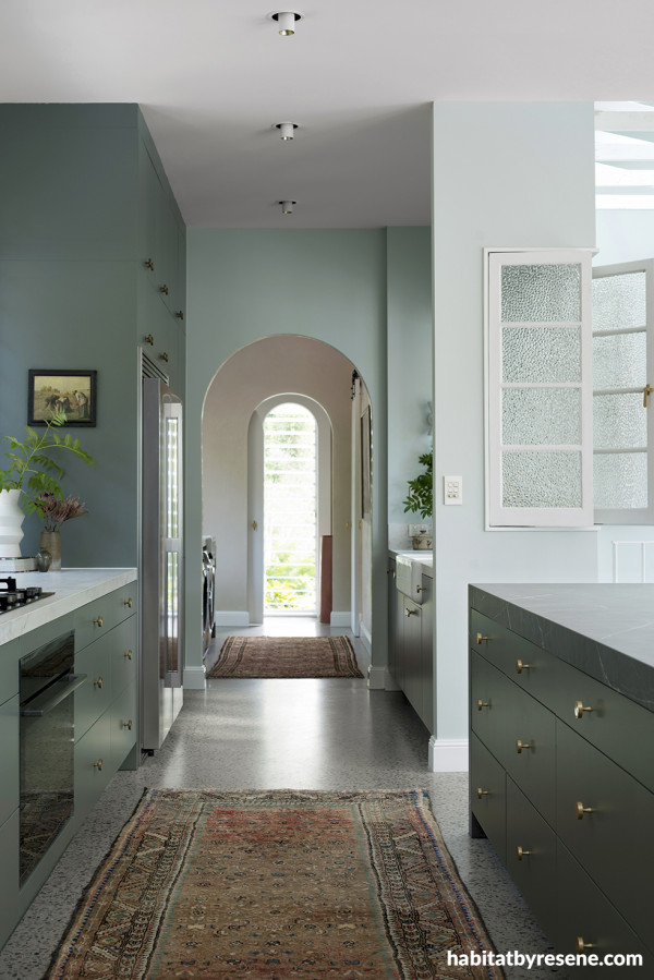 The kitchen is painted in a soft faded green with undertones of tranquillity, Resene Quarter Robin Egg Blue from the Karen Walker Paints collection, with ceiling in Resene Black White.
