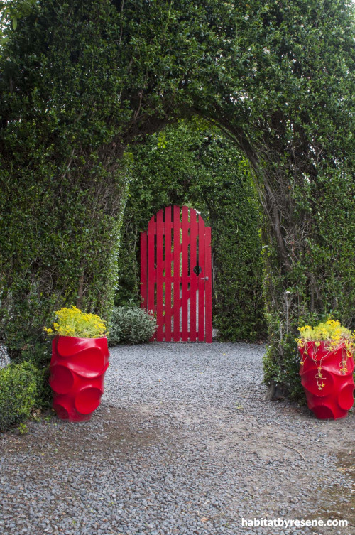 Going against a senior member of the Hurunui Garden committee’s advice, Meg painted the gate beneath the escallonia arch in a bold red called Resene Poppy.