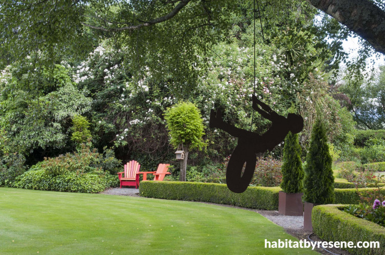 Artist Jane Downes’ metal sculpture of a little boy on a swing hangs from a silver birch tree planted in the 1960s. “That tree has always had swings, pinatas or tyres hanging from it. Now that my kids have grown up and left home, I needed a little boy playing in my garden again.”