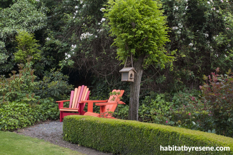 Tom constructed one of the Cape Cod chairs tucked into a corner of the front lawn, and their son Tim built the other chair in his woodwork class when he was at high school. Meg went for bold colours again, painting one chair in the punchy orange Resene Energise and the other in a cocktail of Resene Roadster, Resene Sorbus and Resene Energise.