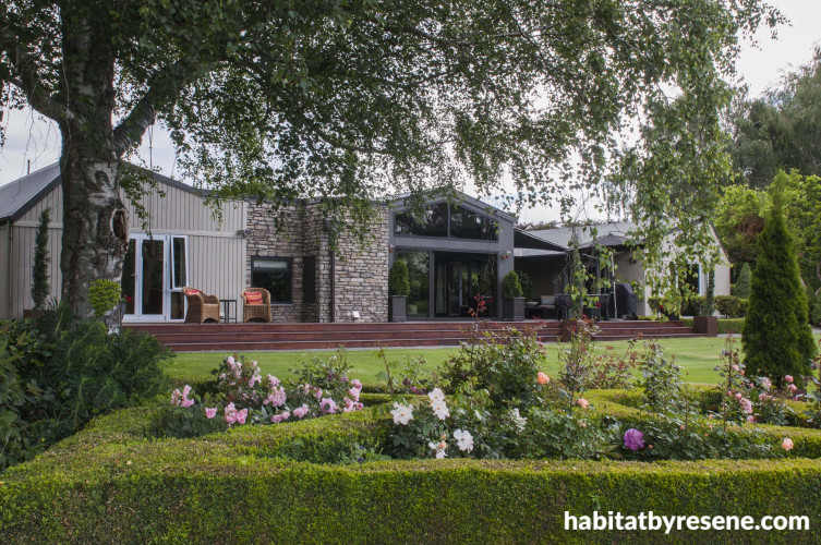 They took over the house and land, situated on one part of a larger family sheep and cattle farm, in 1991, when they were newlyweds. They had 11 boxes of clothes and possessions and no furniture. The “sad brown home” has since had a bold exterior colour change to Resene Napa and Resene Ironsand and was extended following the Kaikōura earthquake in 2016 after one side cracked in half. And the garden has been transformed from pony paddocks into a wonderland; roses, rhododendrons, natives and hedges are shaped into ‘rooms’, knot gardens, and archways. When Meg and Tom open their garden to the public at the Hurunui Garden Festival, visitors love to explore the grounds and see what’s behind the bold red Resene Poppy garden gate.