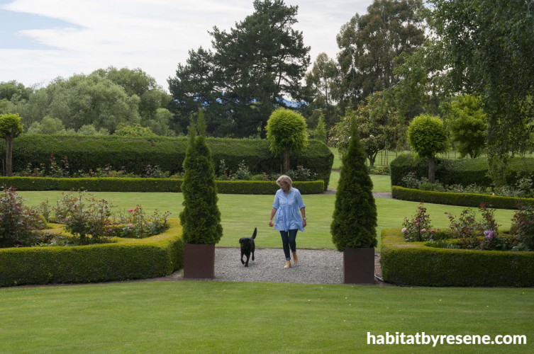 “When I first did the knot garden, it was a disaster. I didn’t know anything about using plumblines or creating a straight hedge, so they were as crooked as a dog’s hind legs. But as the hedges established, I carved them into something a bit straighter,” she says.