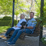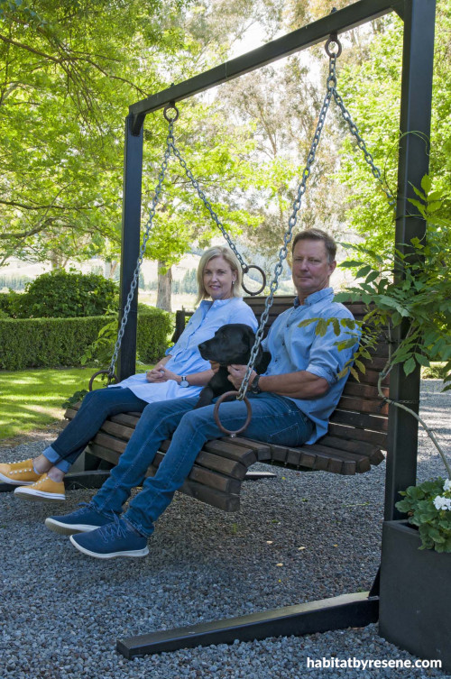 Meg, Tom and their dog Texas love to sit on the swing. A friend built the swing and seat and Tom built the stand which is painted in Resene Ironsand to match the home’s exterior.
