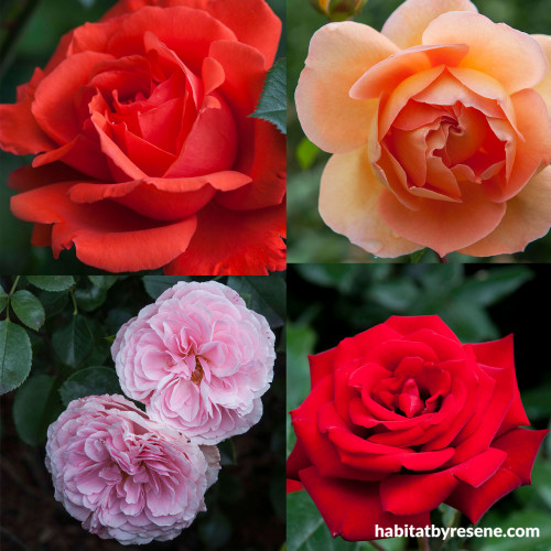 Meg’s rose garden has grown and grown over the years. Pictured clockwise from left ‘Alexander’, ‘Pat Austin’, ‘My Mum’ and ‘Love Heart’.