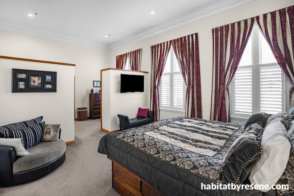 Red tones echo through the home in drapes and décor. This bedroom is painted in Resene Pearl Lusta.