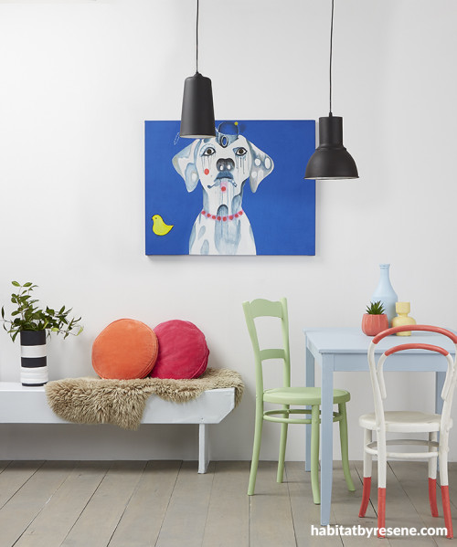 An easy way to make many bright colours work together is to keep the wall colours neutral. A grey-based white like Resene Double Alabaster seen here on the walls will tie in with many colours. Table in Resene Frozen, green chair in Resene Anise and front chair in Resene Bubble White with details in Resene Rapture. Flooring in Resene Colorwood Mid Greywash, bench in Resene Pattens Blue, pendant lamps in Resene Nero, tall vase on table in Resene Frozen, small vases in Resene Rapture and Resene Spring Fever and tall striped vase on bench Resene Double Alabaster with Resene Nero. Round velvet cushions from Castle and Things, sheepskin from Lapco, Dalmation artwork by Jessie Breakwell and plants from Give Plants. Project by Annick Larkin, image by Bryce Carleton.