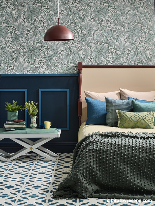 Mixing your favourite Resene wallpaper design with other patterns is the ultimate way to create a maximalist interior that’s packed with personality. Upper wall in Resene Wallpaper Collection 37520-2, lower wall and skirting board in Resene Tangaroa with panelling (created using empty picture frames) and dado rail in Resene St Kilda. Floor in Resene Rice Cake with design in Resene FX Paint Effects medium mixed with Resene Tangaroa (applied through a stencil using a flat artist’s brush to create ‘glazed tile’ effect). Bench seat in Resene Stromboli with legs in Resene Duck Egg Blue. Scrolled headboard in Resene Cashmere trimmed in Resene Scoria and pendant lamp in Resene Scoria. Artwork frame painted in Resene Duck Egg Blue and Resene Rice Cake, vases and small accessories in Resene Stromboli and Resene Sorrento. Drinking glass from Freedom, Grace Popplewell bonsai artwork from Endemic World, emerald cushion (with stacked lines) from H&M Home, other cushions and bobbly throw and bedlinen from Adairs. Project by Kate Alexander, image by Bryce Carleton.