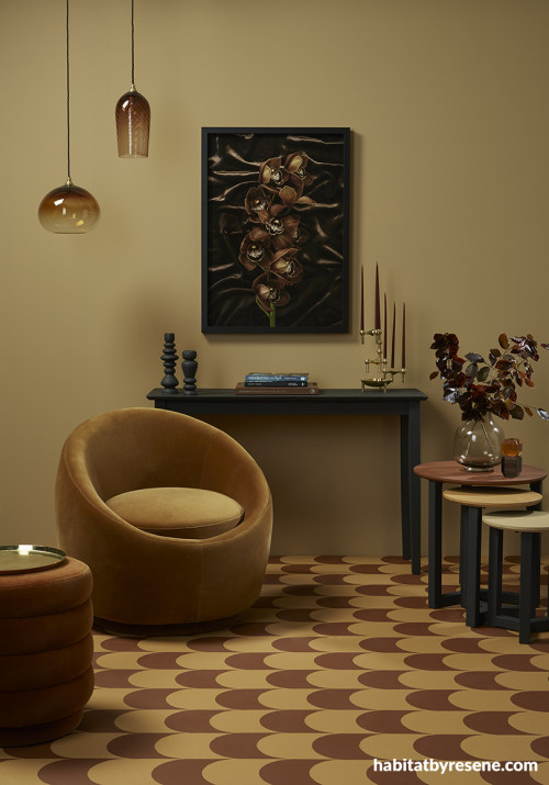 What better way to create whiskey lounge style than a room in a tonal room inspired by the golden tipple? Wall in Resene Gold Coast, with floor in painted ‘tile effect’ in Resene Pendragon and Resene Hairy Heath. Console table in Resene Noir and nesting tables in Resene Hairy Heath (large), Resene Pendragon (medium) and Resene Gold Coast (small) with legs in Resene Noir. Candlesticks in Resene Noir. Armchair and ottoman from Soren Liv, cushion from Adairs, brass candelabra from Good Form, orchid artwork by Helen Bankers, pendant lights from Monmouth Glass Studio. Project by Melle Van Sambeek, image by Bryce Carleton.