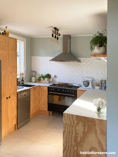 Tineka and Sam chose the tranquil pastel green hue of Resene Quarter Robin Egg Blue for the walls in the kitchen. Alongside the plywood cabinets, it creates a warming and inviting space. The addition of Resene Black White on the ceiling and window trims and pressed metal splashback provides a dose of fresh, bright white.
