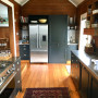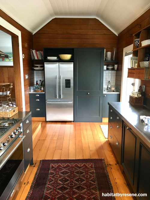 One room that Raewyn didn’t want to change – much – was the kitchen. “Mum wanted to retain the original kitchen but to update the cabinetry and benchtops,” says Clare. “The cabinets were repainted in Resene Blackjack to create a moody kitchen, offset against the kauri panelling and modernised with stainless steel benchtops.”