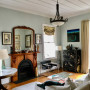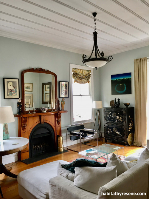 A small south-facing bedroom was painted in Resene Beethoven, a gentle terracotta shade that Clare says brings the room to life. The moody green/blue Resene Smalt Blue, a colour particularly suited to heritage-style homes, was chosen for Raewyn’s bedroom. “The master bedroom is next door to the lounge,” says Clare. “So Resene Smalt Blue is viewed side by side with Resene Quarter Robin Egg Blue. The blue/green of both work harmoniously with each other, while creating two very different feelings within each room.