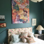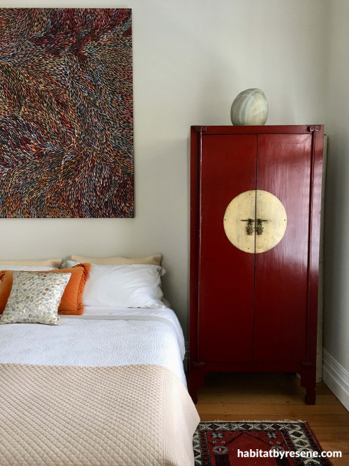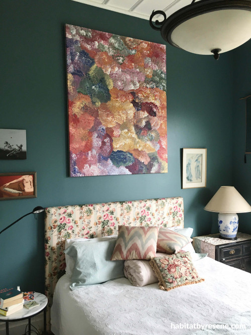 The walls of the master bedroom, painted in Resene Smalt Blue from the Karen Walker Paints collection, create a fantastic backdrop for a sizeable Aboriginal painting, which has blue and green within it.