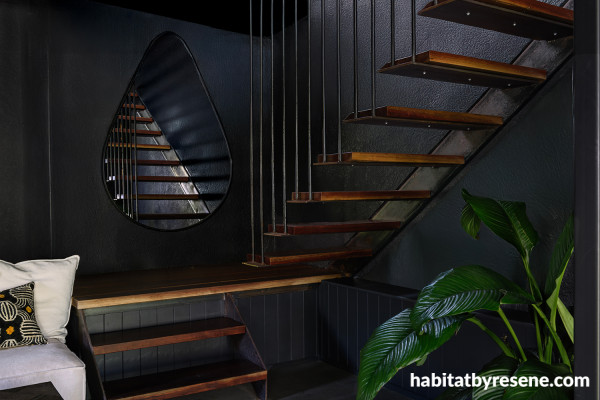 Descending into the new level is deliberately cinematic. “I love this whole lower level, it’s immersive, it has a pulse. As you descend the steel and spotted gum staircase, you get a glimpse of what’s to come. It feels a little like entering a club… there’s tension, anticipation.” Inside, the palette “leans masculine, yet it’s unmistakably a woman’s home. Strength sits confidently in the steel, concrete, stainless and smoky glass, then softens through linen, leather, timber, woven elements and greenery. It’s a balance of grit and grace – curated, grounded, unapologetic.”